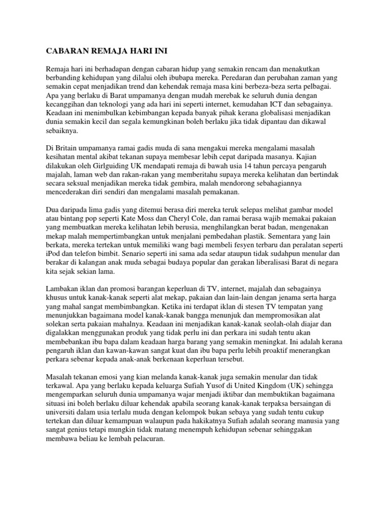 Cabaran Remaja Masa Kini - Merealisasi Remaja Cemerlang - Cabaran seorang guru masa kinikejayaan dan keberkesanan pendidikan banyak berkait rapat dengan kesedaran, keinsafan dan tanggungjawab guru sebagai pendidik, di…. Get notified when remaja masa kini (complete) is updated. See more of cabaran masa kini on facebook. Adapun masalah yang dihadapi remaja masa kini antara lain : Persediaan remaja bererti langkah yang perlu dilakukan oleh remaja, manakala cabaran hidup moden bermakna halangan yang bakal ditempuhi pada zaman moden ini. Remaja pada masa kini tidak dapat lari dari menghadapi arus globalisasi yang semakin rancak.